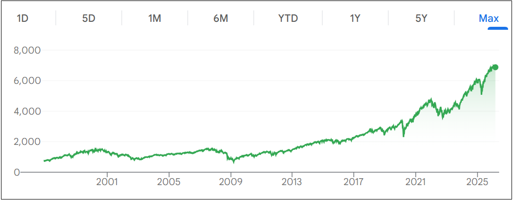 Money invested in the S&P500 has been doubling in price every 8 years on average since the 1990s: