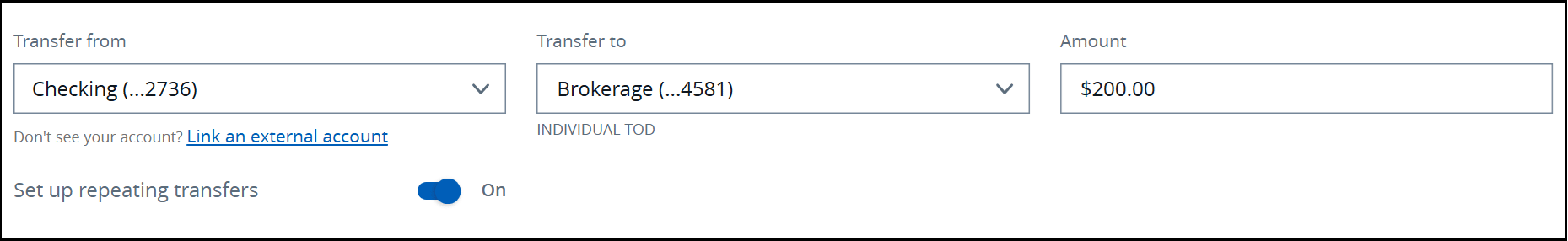 After setting up my brokerage account, in the beginning $200 transferred once a month from my checking account to my brokerage account automatically.